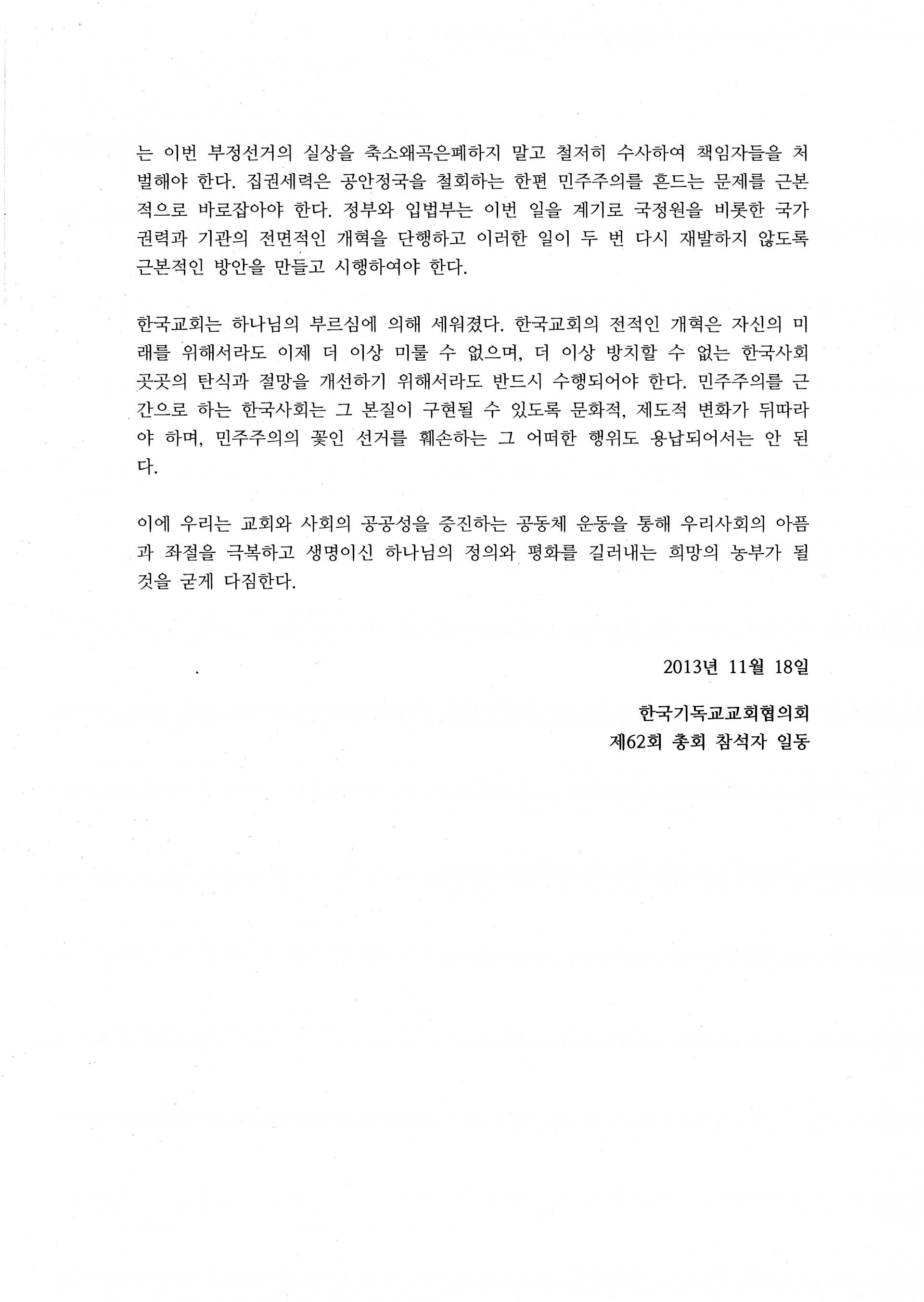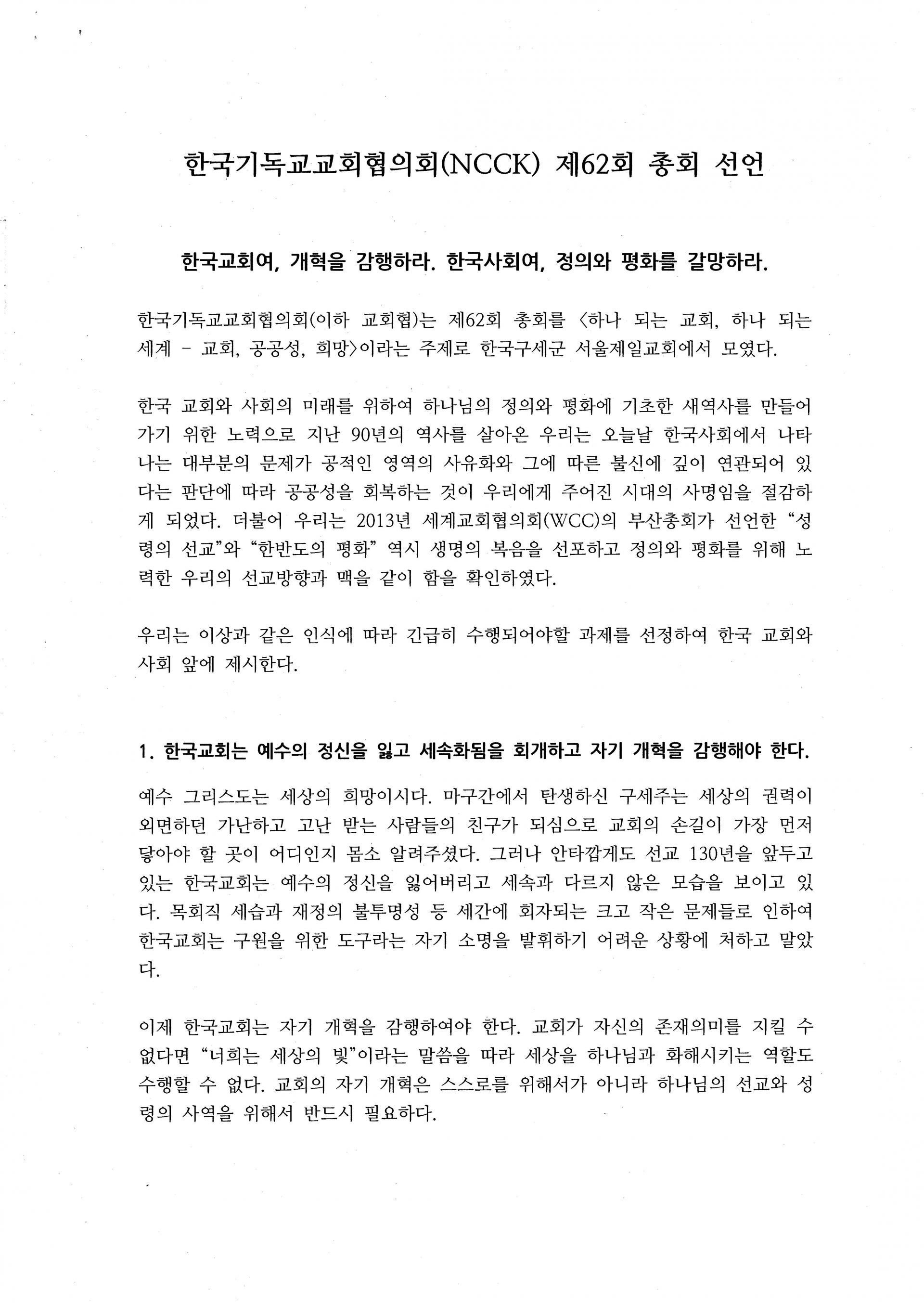한국기독교교회협의회 제62회 총회 선언문