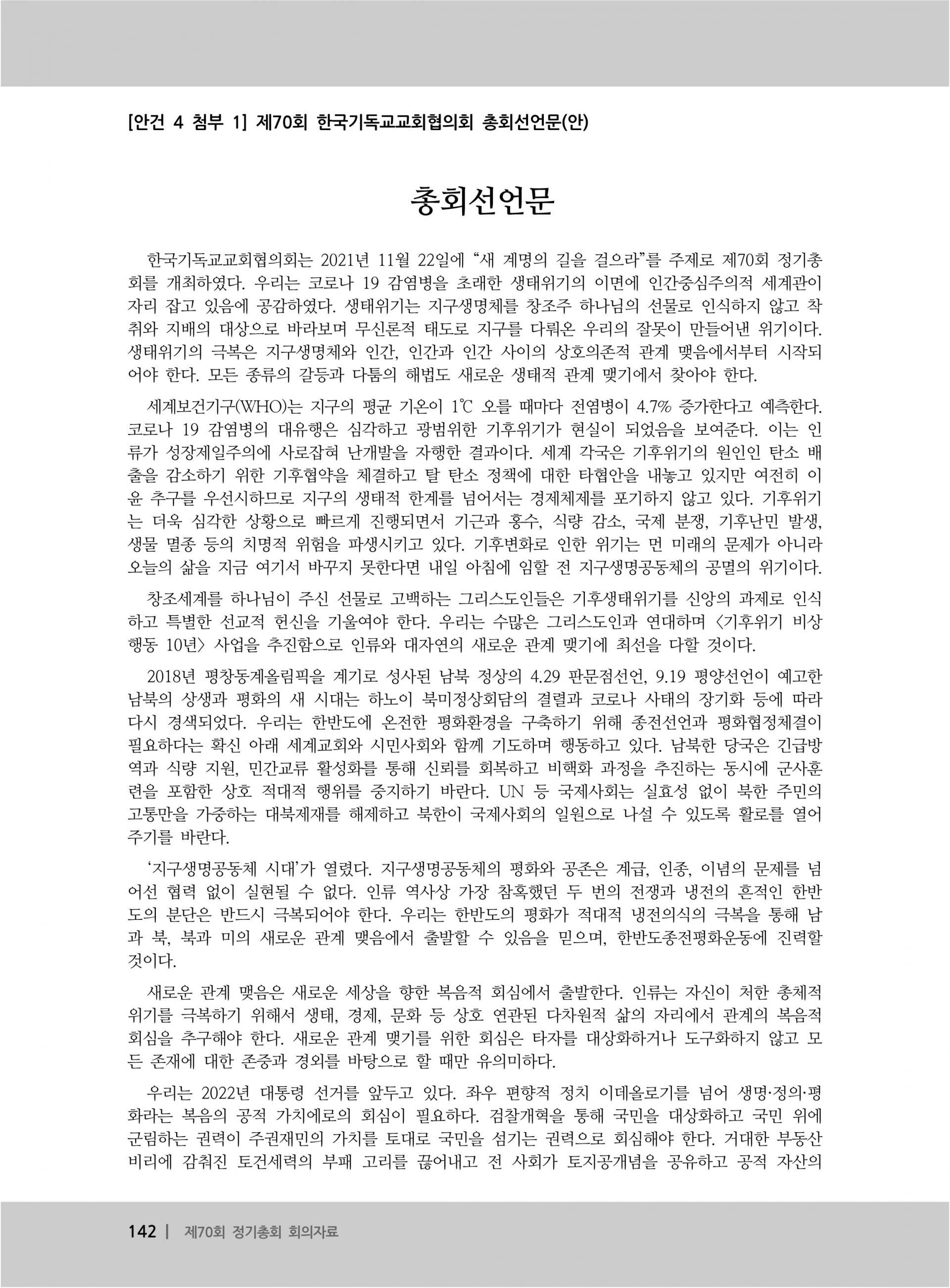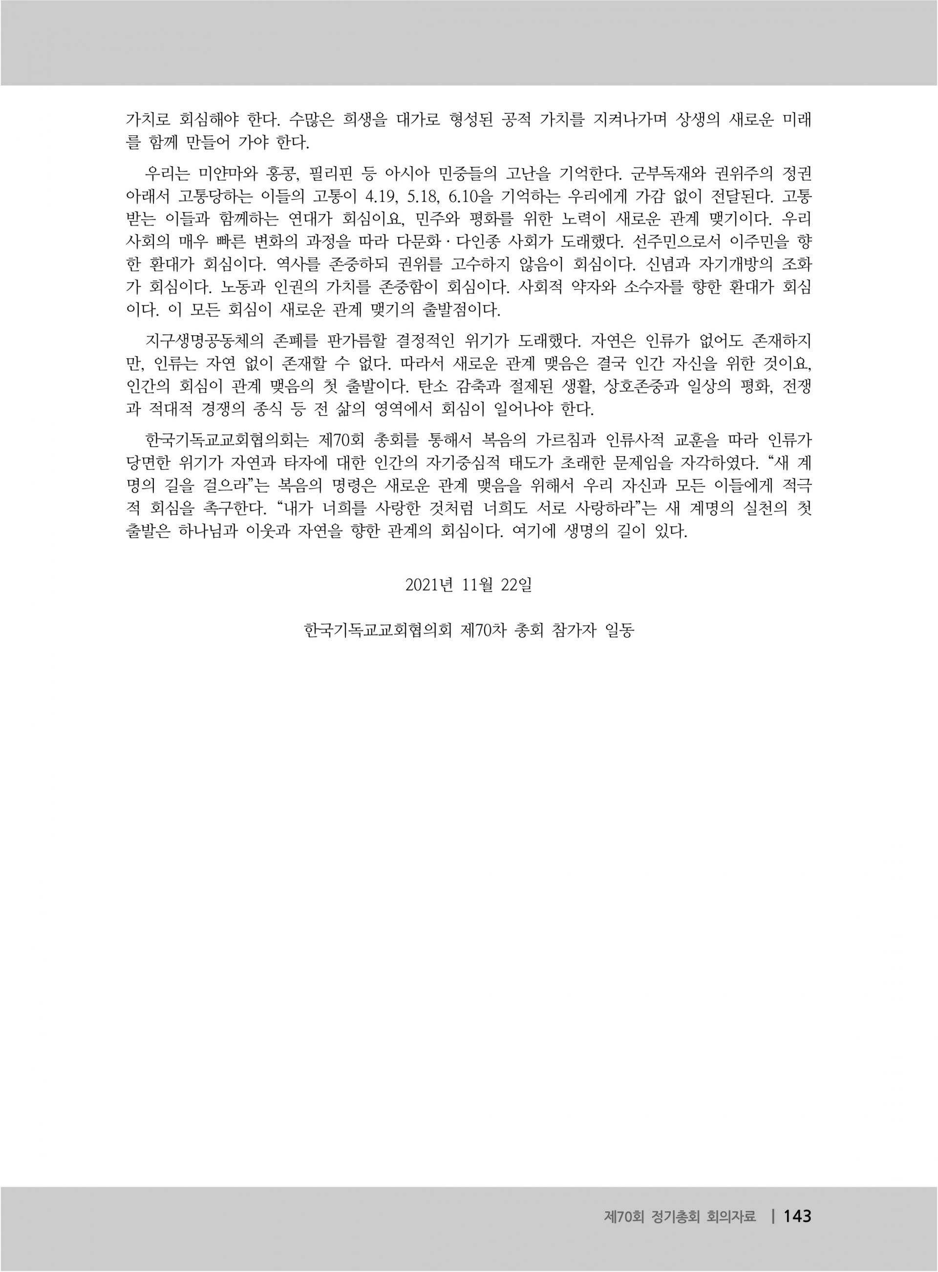 한국기독교교회협의회 제70회 총회 선언문