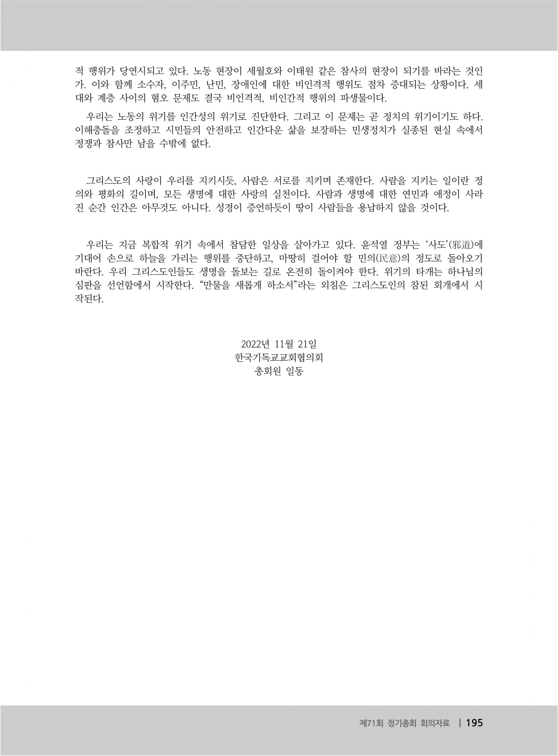 한국기독교교회협의회 제71회 총회 선언문