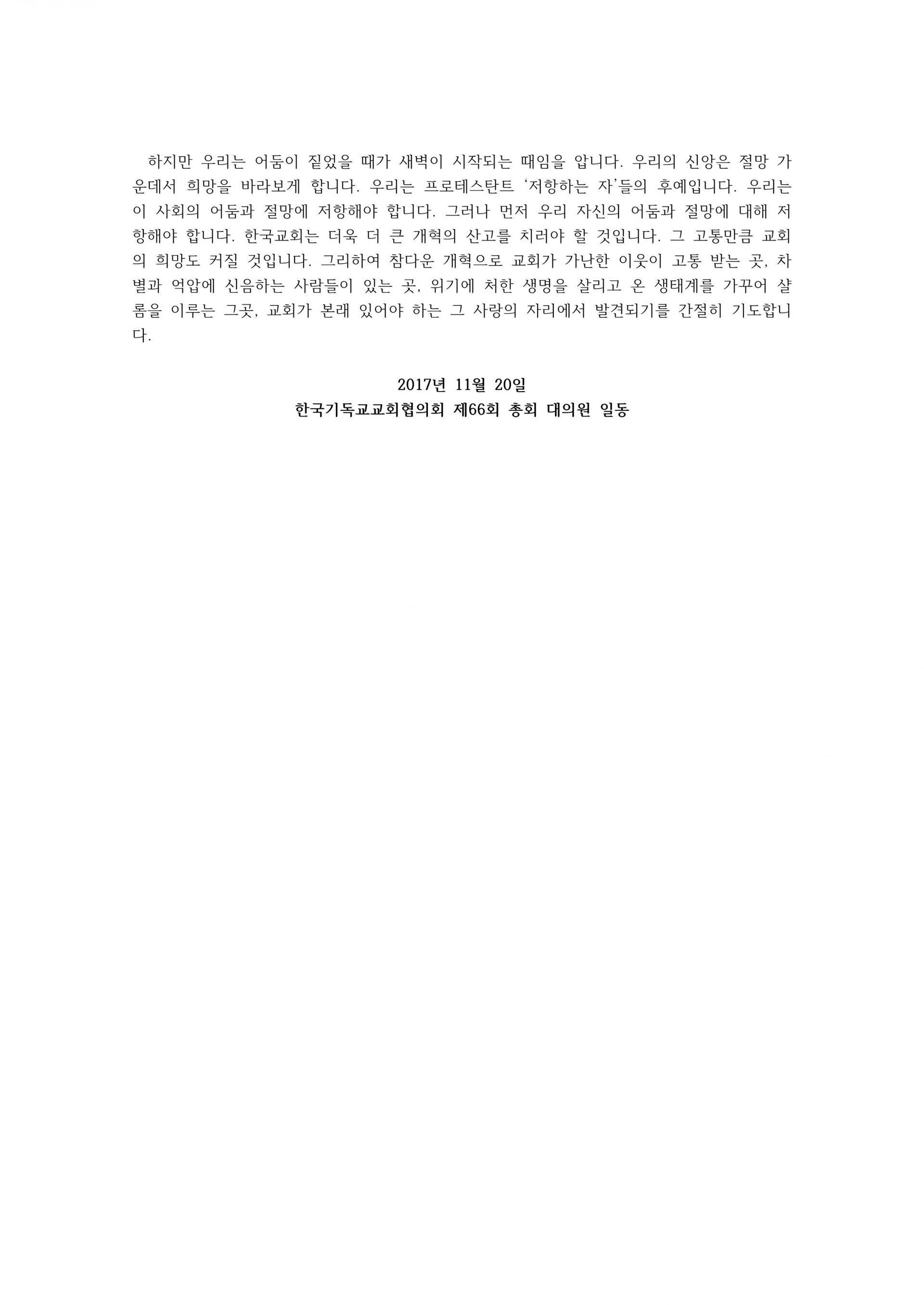 한국기독교교회협의회 제66회 총회 선언문