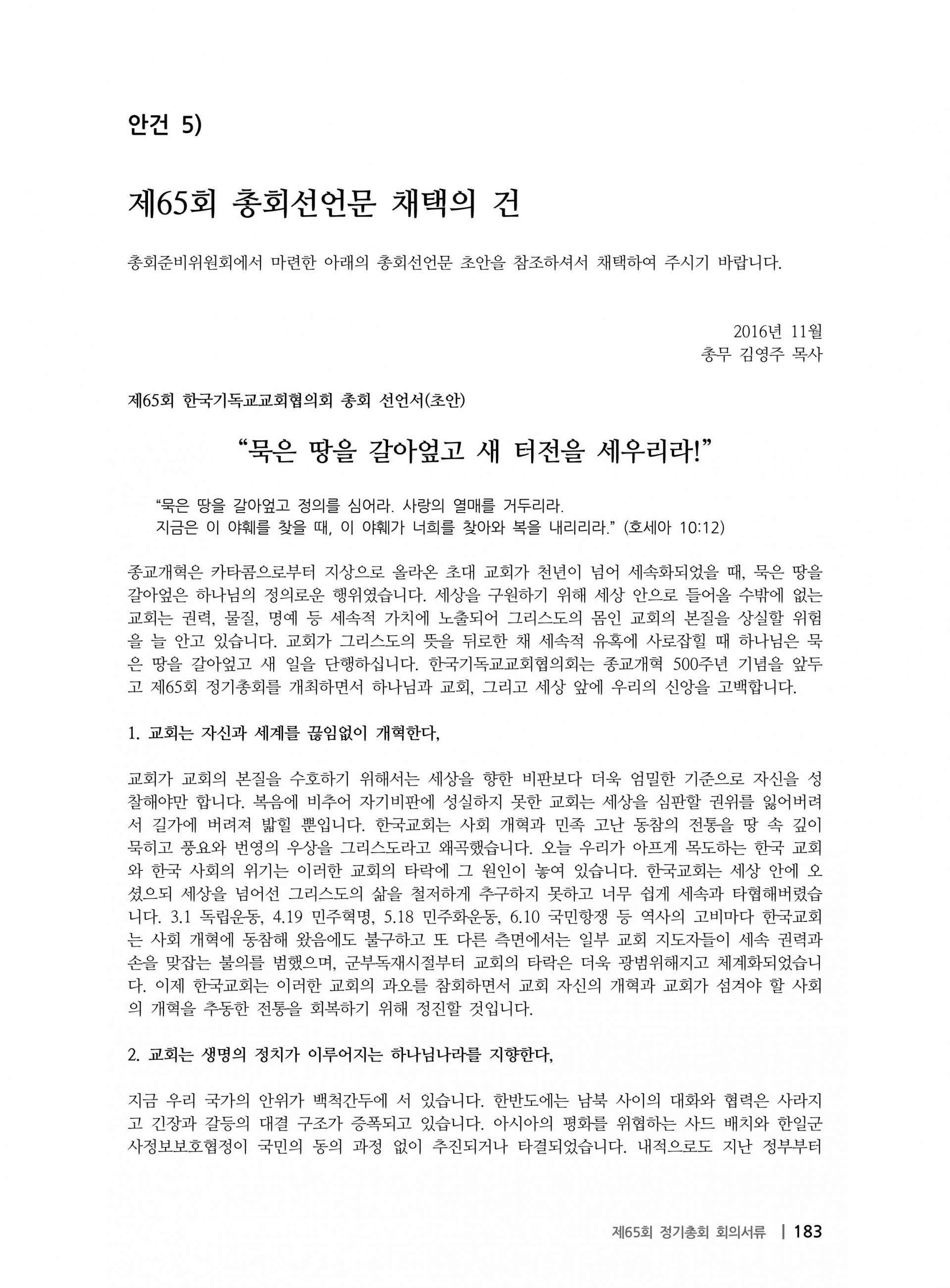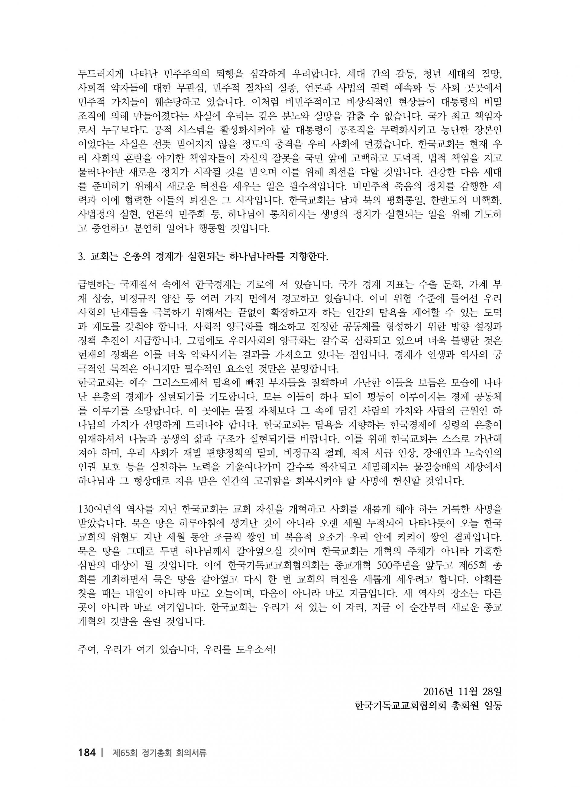 한국기독교교회협의회 제65회 총회 선언문