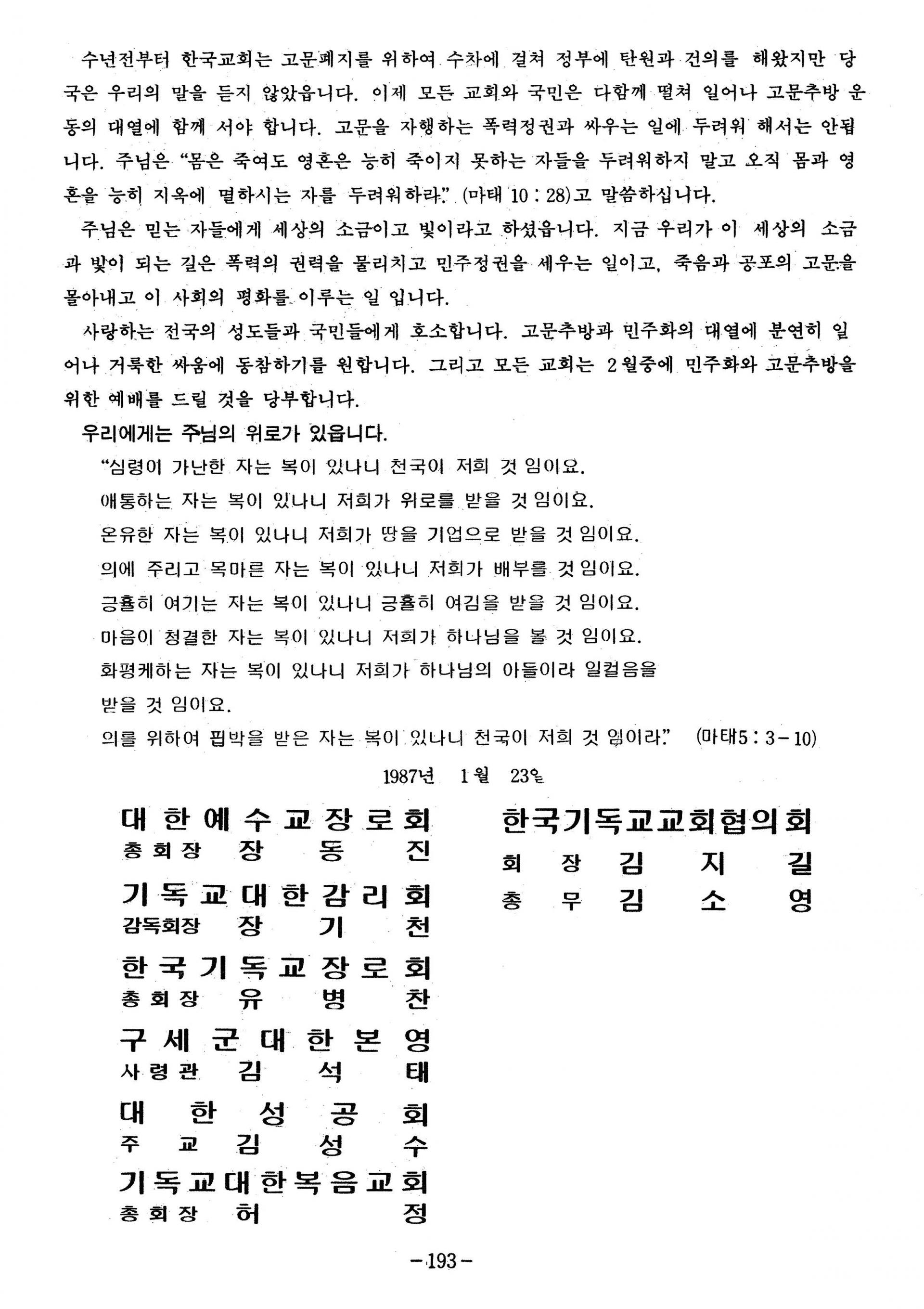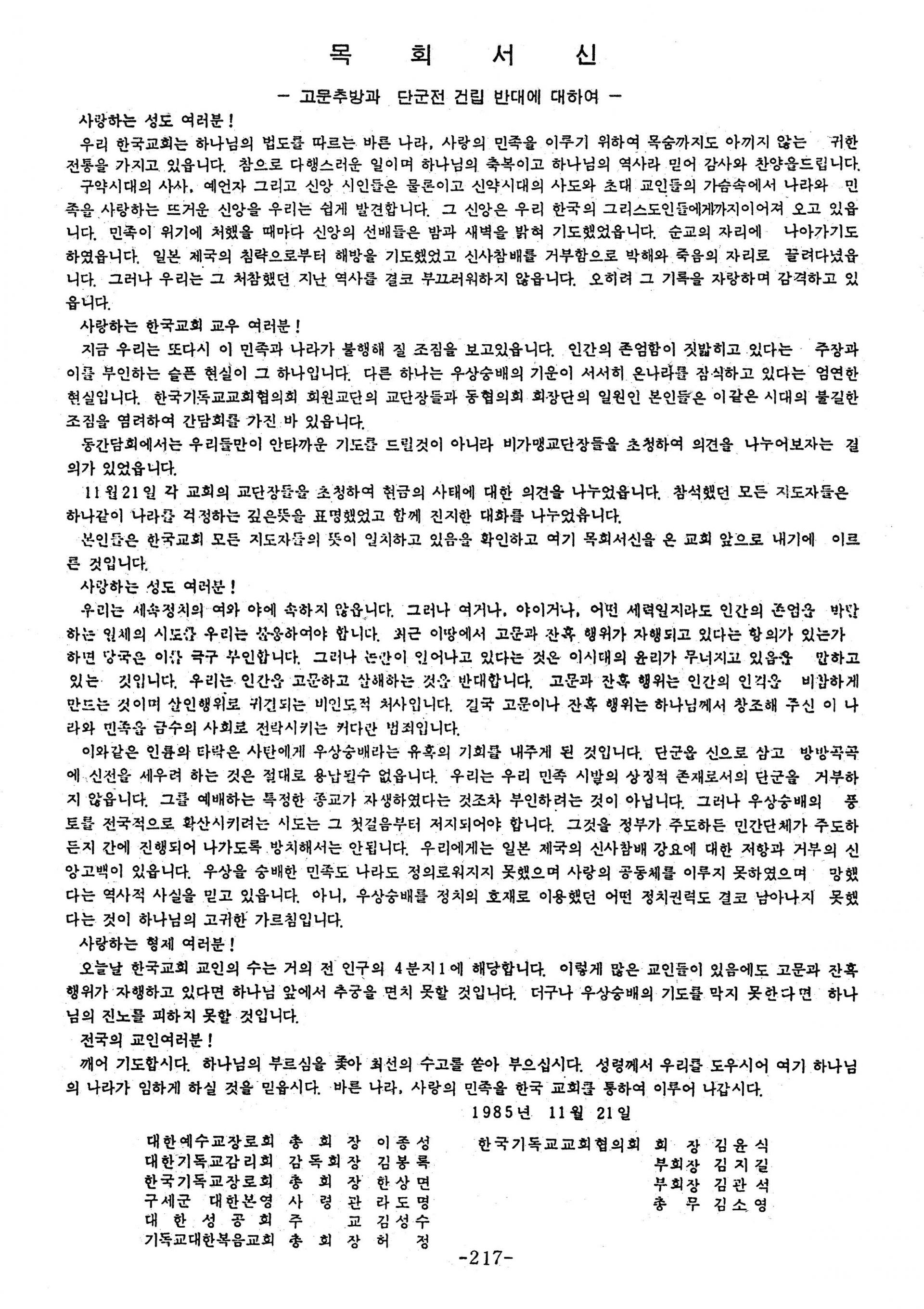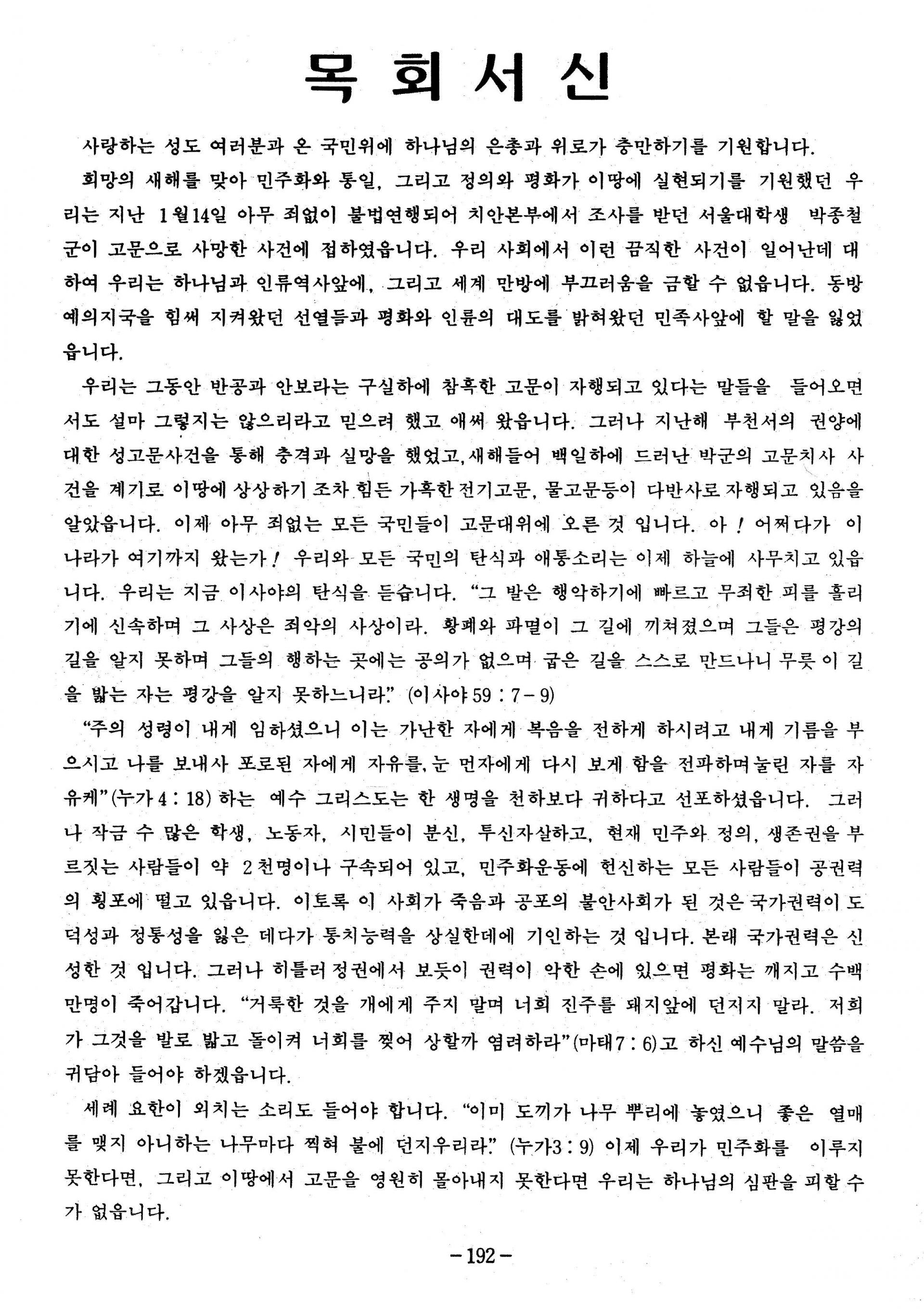 목회서신 - 박종철 사망사건, 고문폐지
