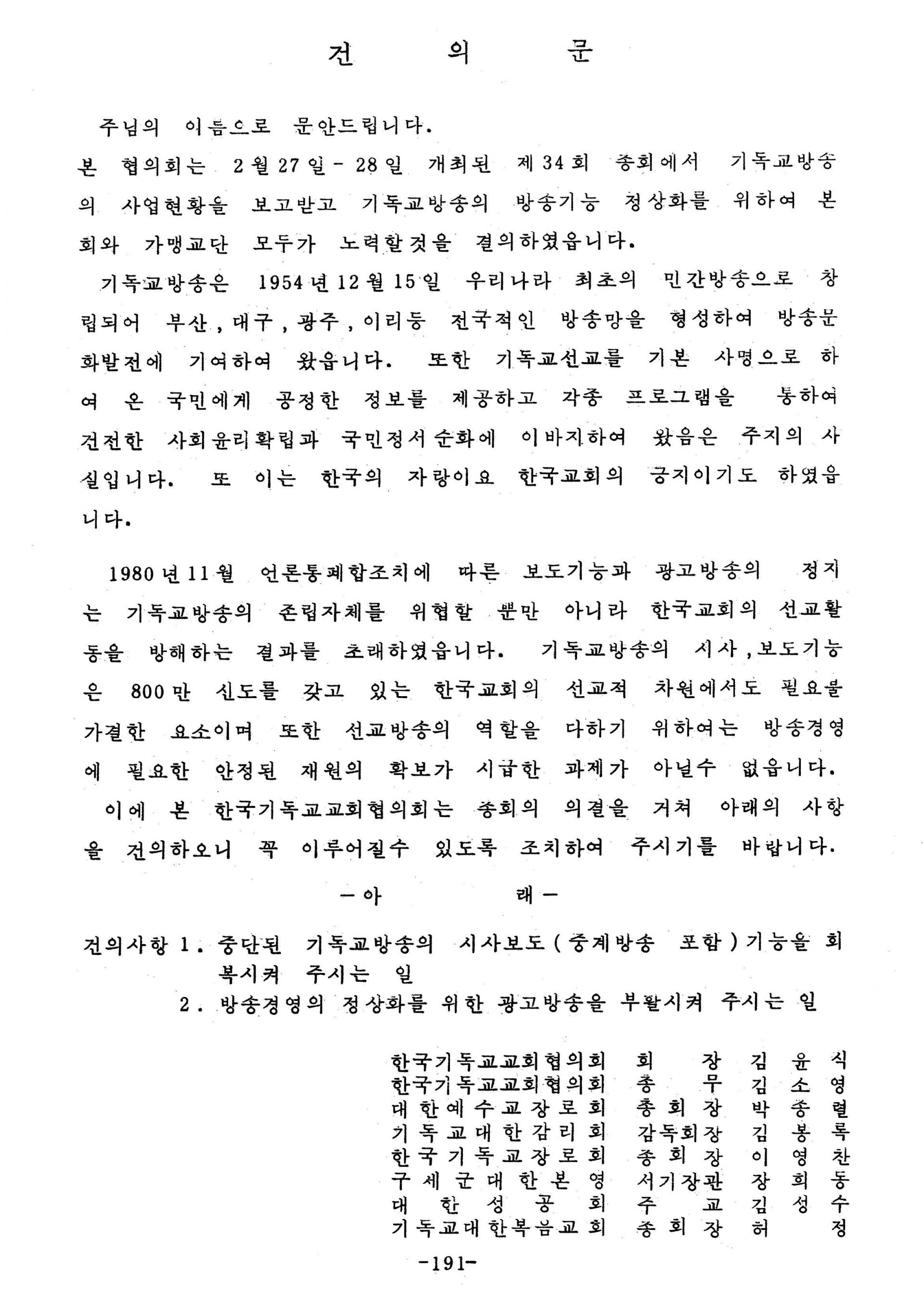 기독교방송 정상화에 대한 건의문