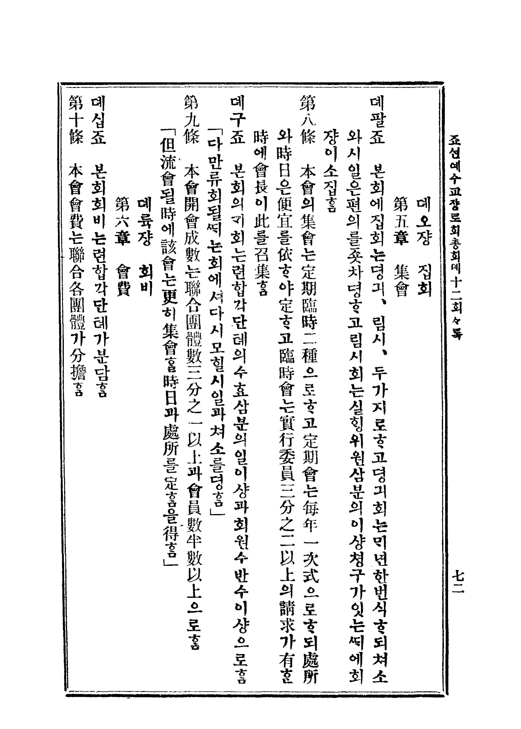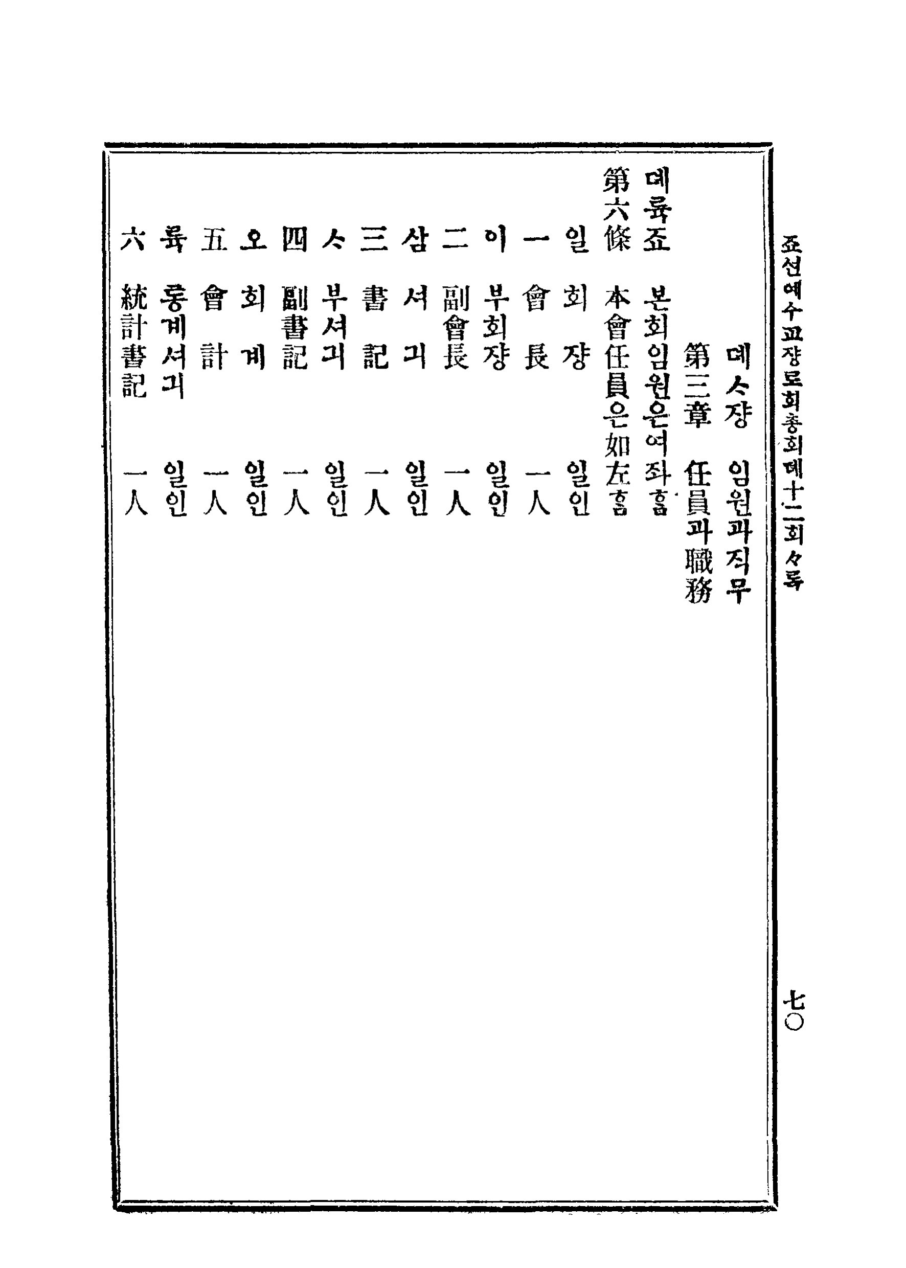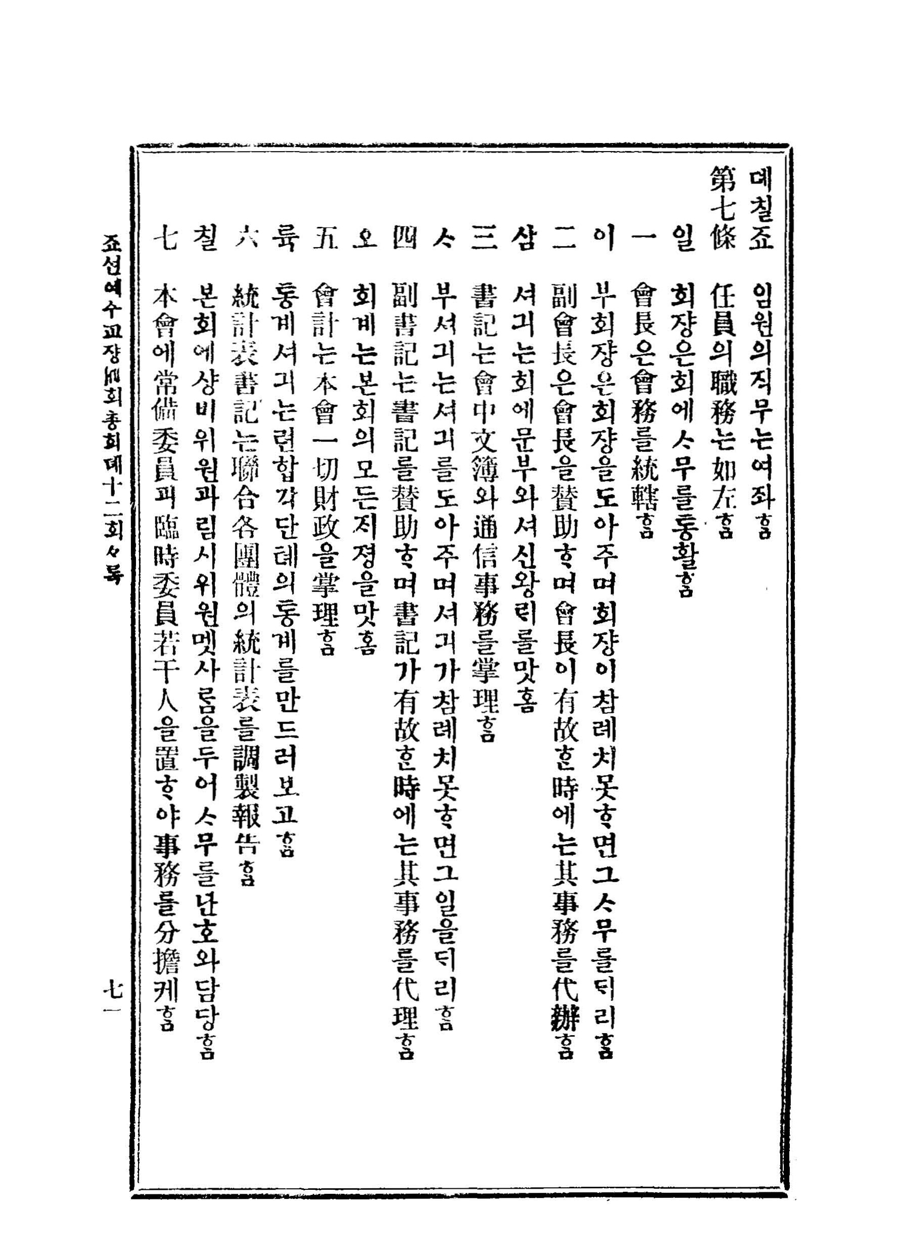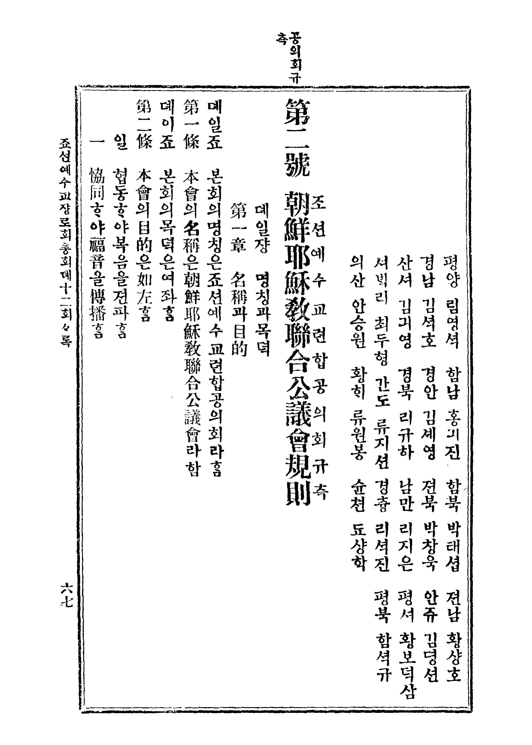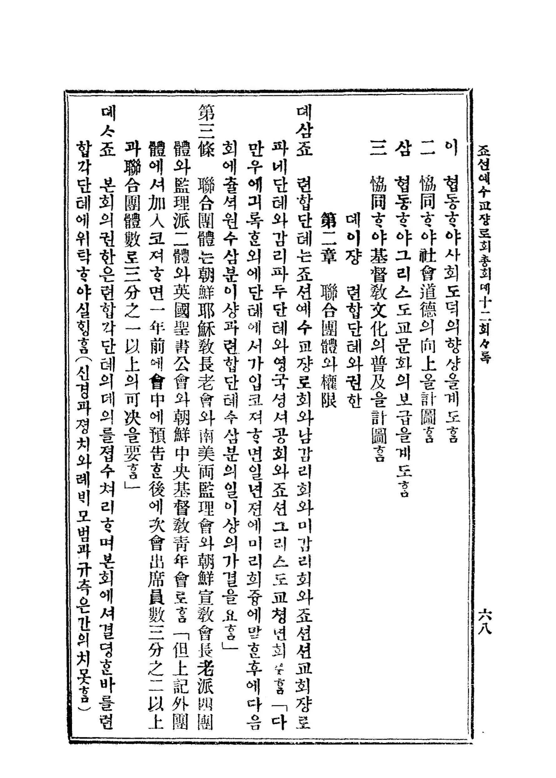 뎨일쟝 뎨이됴, 본회의 목뎍 一. 협동ᄒᆞ야 복음을 선젼ᄒᆞᆷ. 二. 협동ᄒᆞ야 샤회도덕의 향상을 도모ᄒᆞᆷ. 三. 협동ᄒᆞ야 긔독교 문화를 보급케ᄒᆞᆷ. 뎨이쟝 뎨ᄉᆞ됴 본회의 권한은 연합 각 단톄의 뎨의(提議)를 밧어 처리ᄒᆞ며 본회에서 결의ᄒᆞᆫ 바는 연합 각 단톄에 맛겨 실ᄒᆡᆼ케 ᄒᆞᆷ.(신경과 정치와 레ᄇᆡ 모범과 규측은 간여치 못ᄒᆞᆷ) |