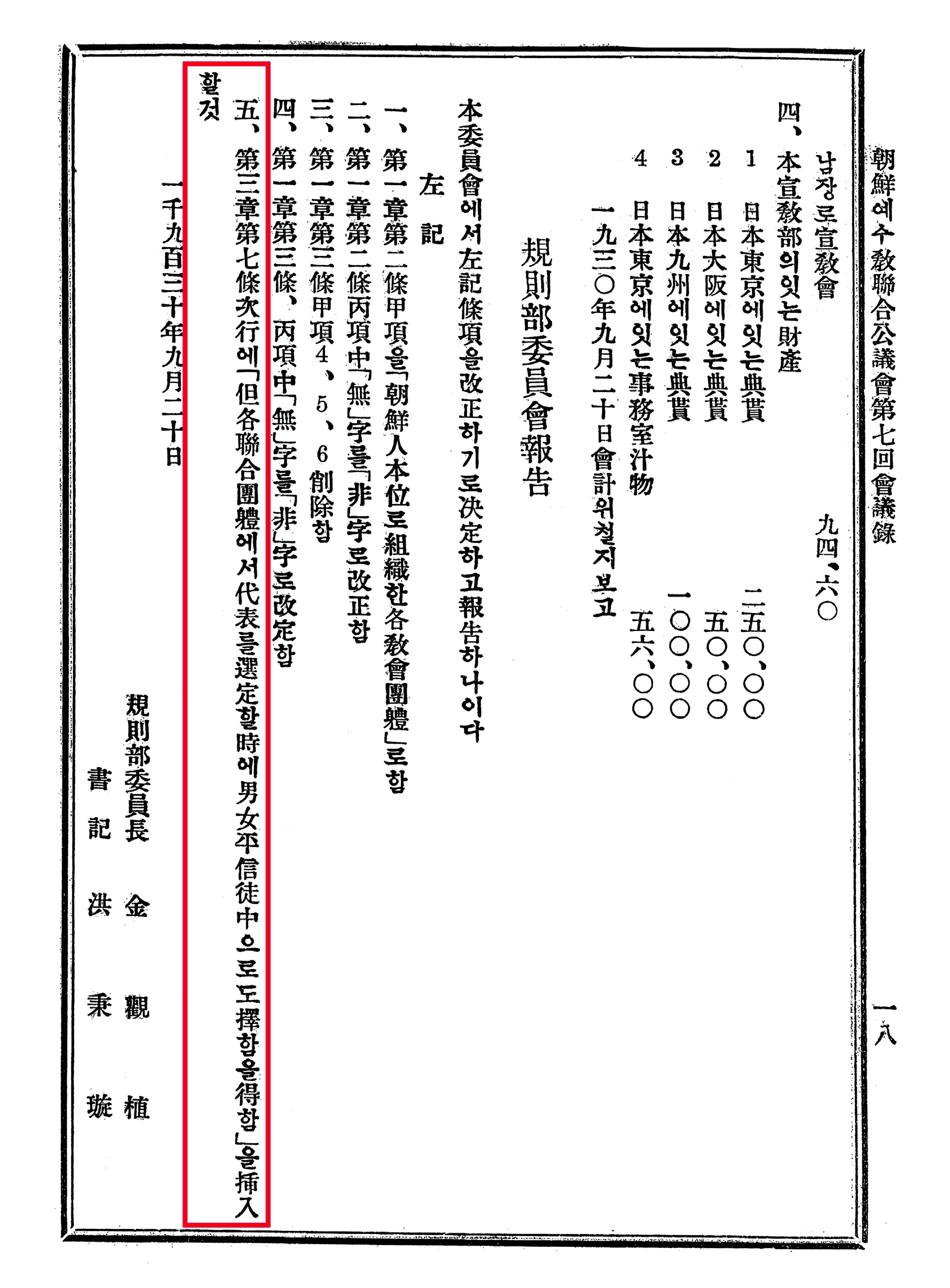 여러 가지 한계에도 불구하고 한국교회의 역사 속에서 여성의 지위는 조선예수교연합공의회를 통해서 향상되었음을 살펴볼 수 있다. 조선예수교연합공의회는 1930년 제7회 총회에서 헌법 제3장의 제7조 ‘회원’에 관한 조항에서 “단 각 연합단체에서 대표를 선정할 시에 남녀평신도 중으로도 택함을 득함”이라는 표현을 삽입하도록 헌법을 개정하면서 여성의 활동을 보장하였다. 【한국기독교사회운동사 자료집 제1권】 260, 268쪽
