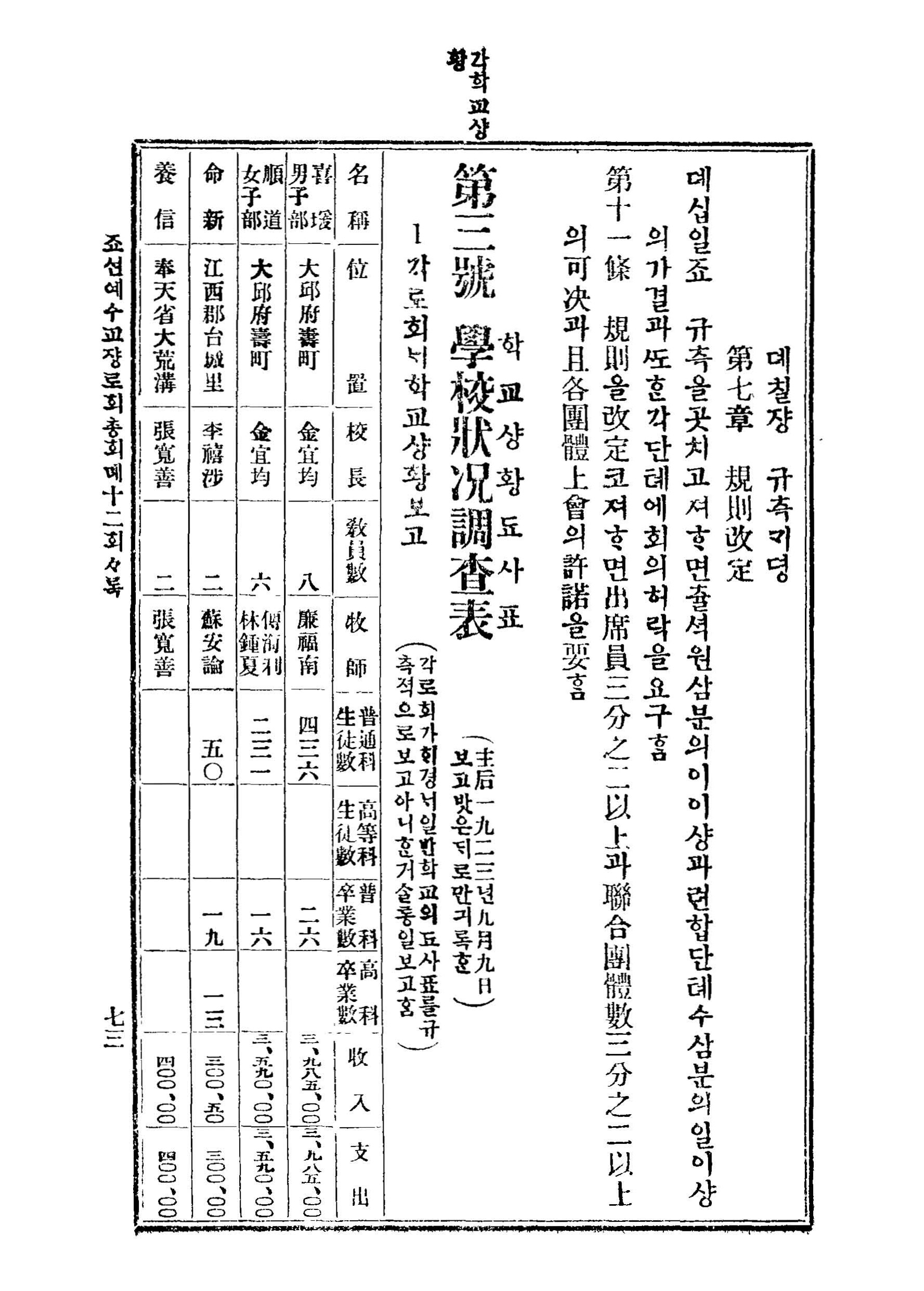규측부위원 보고 본부결의상항을 여좌히 보고함 一, 본부조직, 부장 강병주, 서기 라시산 二, 장로회 총회에서 제의한 본 공의회를 교파단체로 하자는 것은, 세계련합공의회규측이 비교파 단체로 가입케 한것이오며 우리 공의회도 세계련합공의회와 관계를 맷는 이상 비교파 단체를 가입한 것이 임이 잘된줄 아오며 三, 장로회 총회에서 규측 제7조를 개정하야 대표자수를 5인으로 축소하자는 것은 5인만으로는 너무나 소수인고로 장감양교파에서는 각 10인식으로 하고 각 선교회의 각 단체에서는 반수를 감하되 3인은 2인으로하고 1인은 그냥 1인 그대로 함이 가한줄 아나이다. |